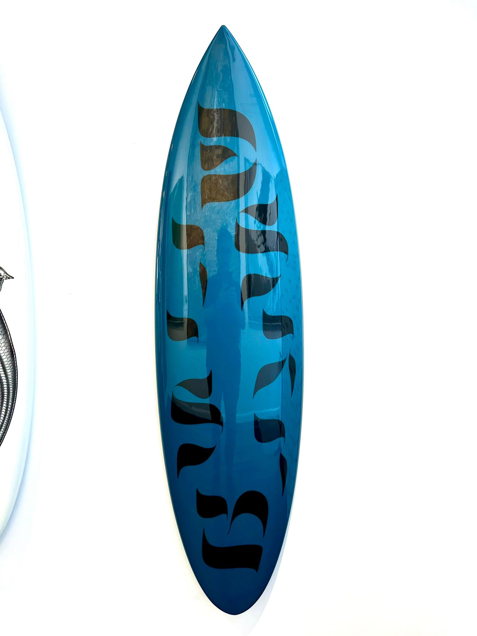 The use of green and turquoise hues symbolizes creation rather than destruction, highlighting the way humans perceive colors and meaning. The unique typographic design integrates three script styles historically tied to Hebrew, representing the evolution of written communication and the bridge between past, present, and future. This surfboard serves as a reminder that only through connection and shared understanding can we illuminate the darkness and achieve true harmony.