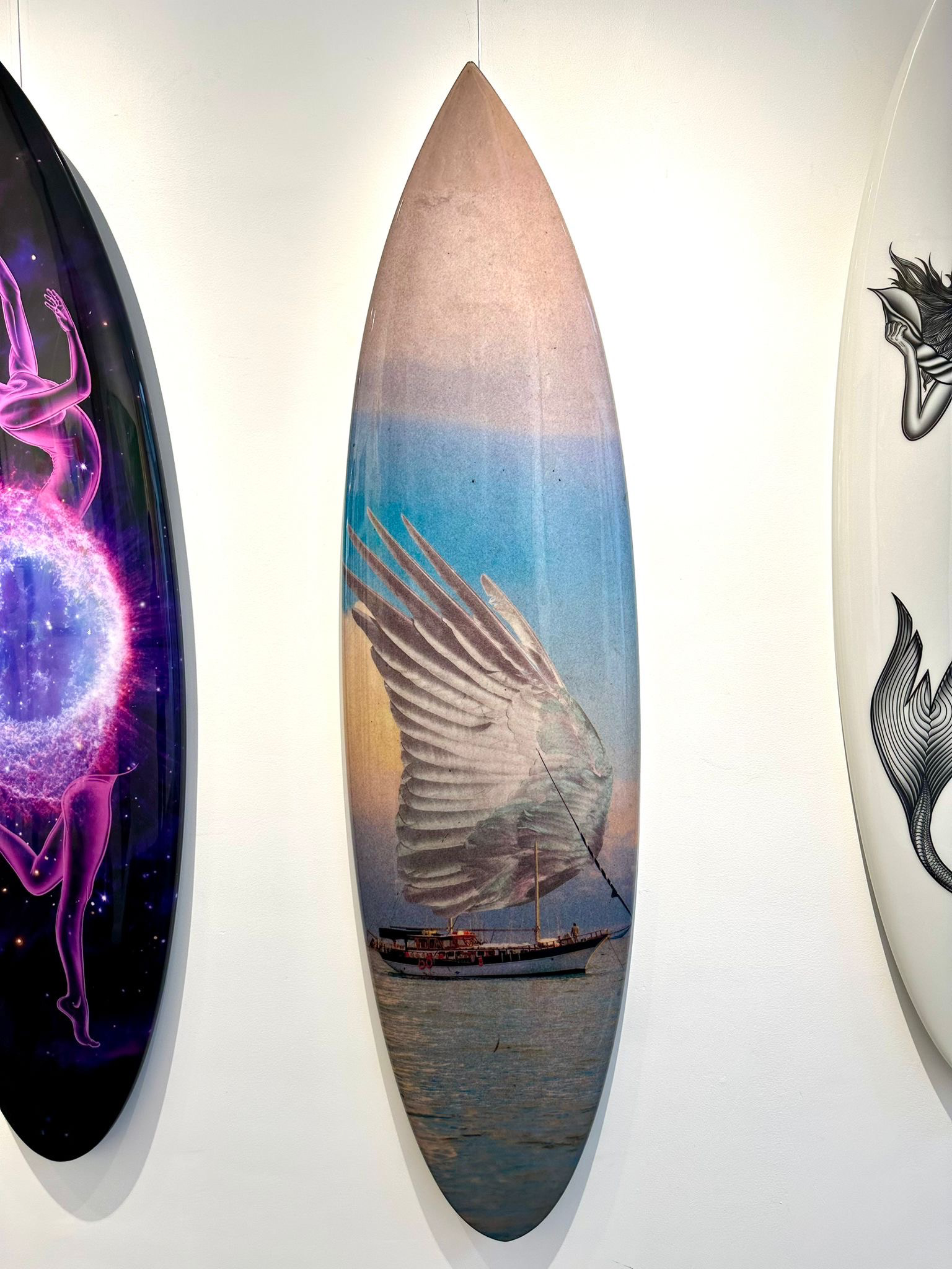 Inspired by the story of Adam and Eve, the concept examines temptation, free will, and the consequences of surrendering to material desires, drawing parallels to the exploitation of natural resources, religious divisions, and humanity’s pursuit of power and control. The surfboard’s visual elements reflect the interconnectedness of time, nature, and religions, inviting the viewer to ask: What is our role in this cycle of existence, and what legacy will we leave for the world that comes after us?